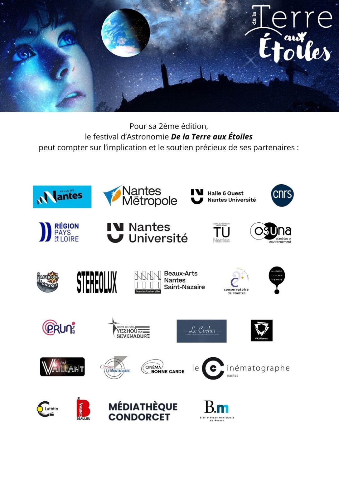 Elles ont été rejointes par les partenaires suivants : la Halle 6 Ouest de Nantes Université, les Médiathèques de Nantes, le TUNantes, la Direction du Patrimoine et de l’Archéologie, les associations d’astronomes amateurs du Cocher à la Chapelle-sur-Erdre et Sautron Astronomie, les artistes Mickaël Lafontaine et Em de Korsak, le collectif d’artistes Projeta, le Conservatoire de Nantes, l’Ecole des Beaux-arts de Nantes, les cinémas associatifs de la métropole, le Pôle métropolitain CSTI, la Direction Mission Publics et Citoyenneté Culturelle de la Direction Générale Cultures et Arts dans la Ville, Séquoia, l’Osuna, VR2Planets, Stéréolux, le Musée Jules Verne… Le programme complet et la liste des partenaires