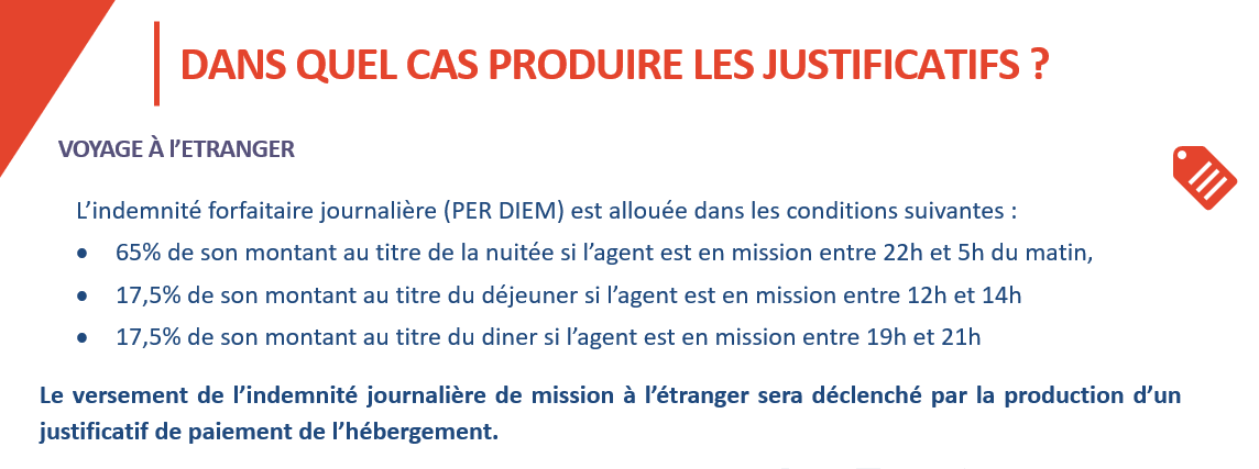 - L’indemnité forfaitaire journalière prévue pour les missions à l’étranger est allouée sur présentation du justificatif d’hébergement à votre nom et des tickets de caisse pour les repas.